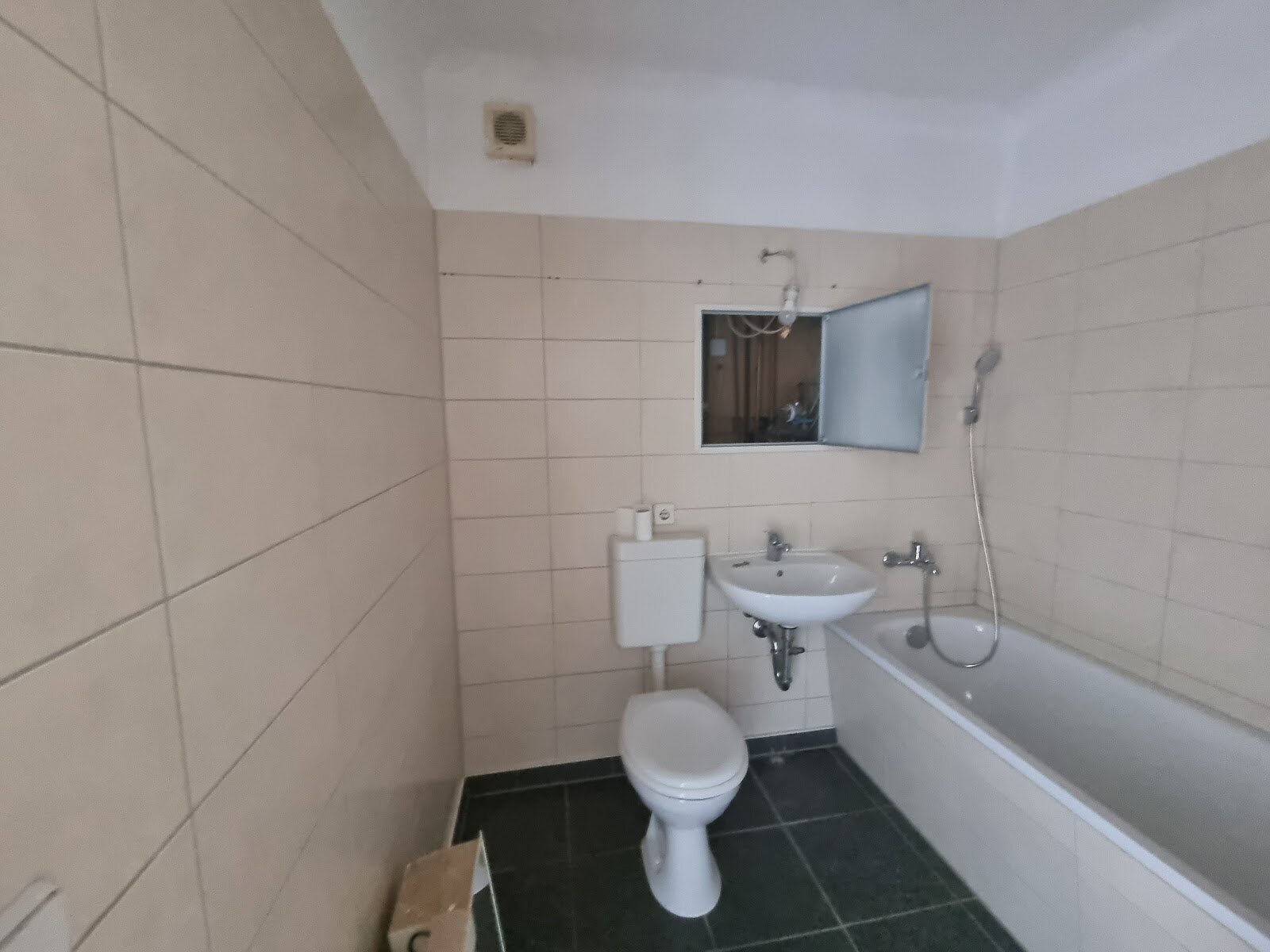 - Anthrazite Boden- und weiße Wandfliesen im Bad