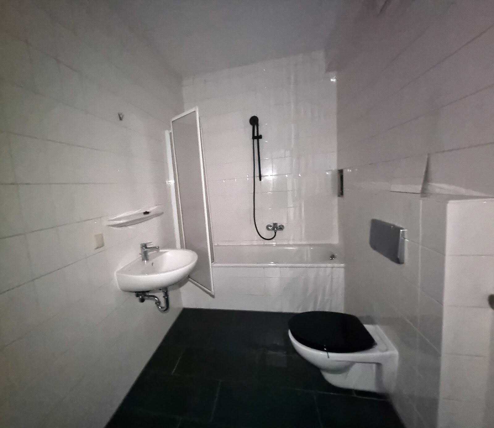 - Anthrazite Boden- und weiße Wandfliesen im Bad