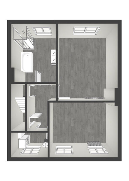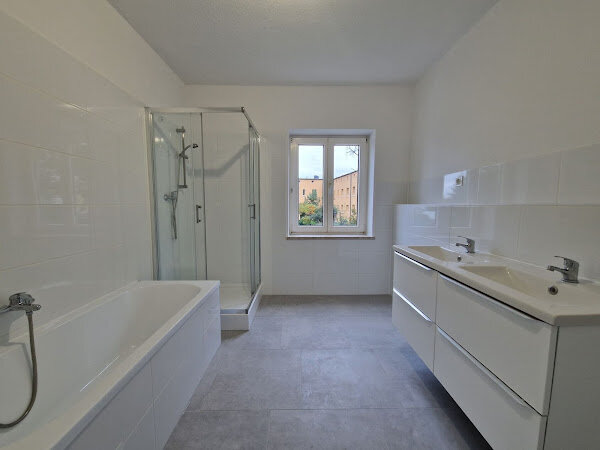 - Geräumiges Tageslichtbad mit Dusche, Badewanne sowie 2 Waschtischen inkl. Unterschrank