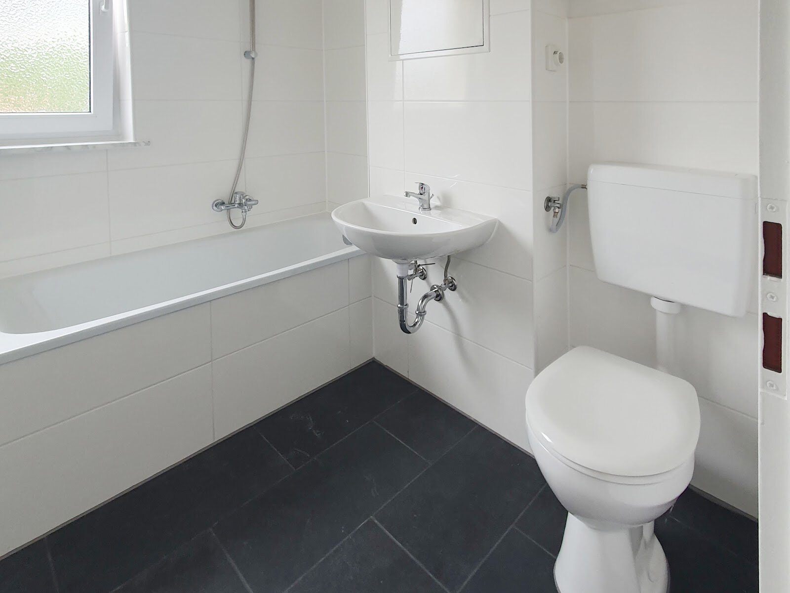 - Anthrazite Boden- und weiße Wandfliesen im Bad