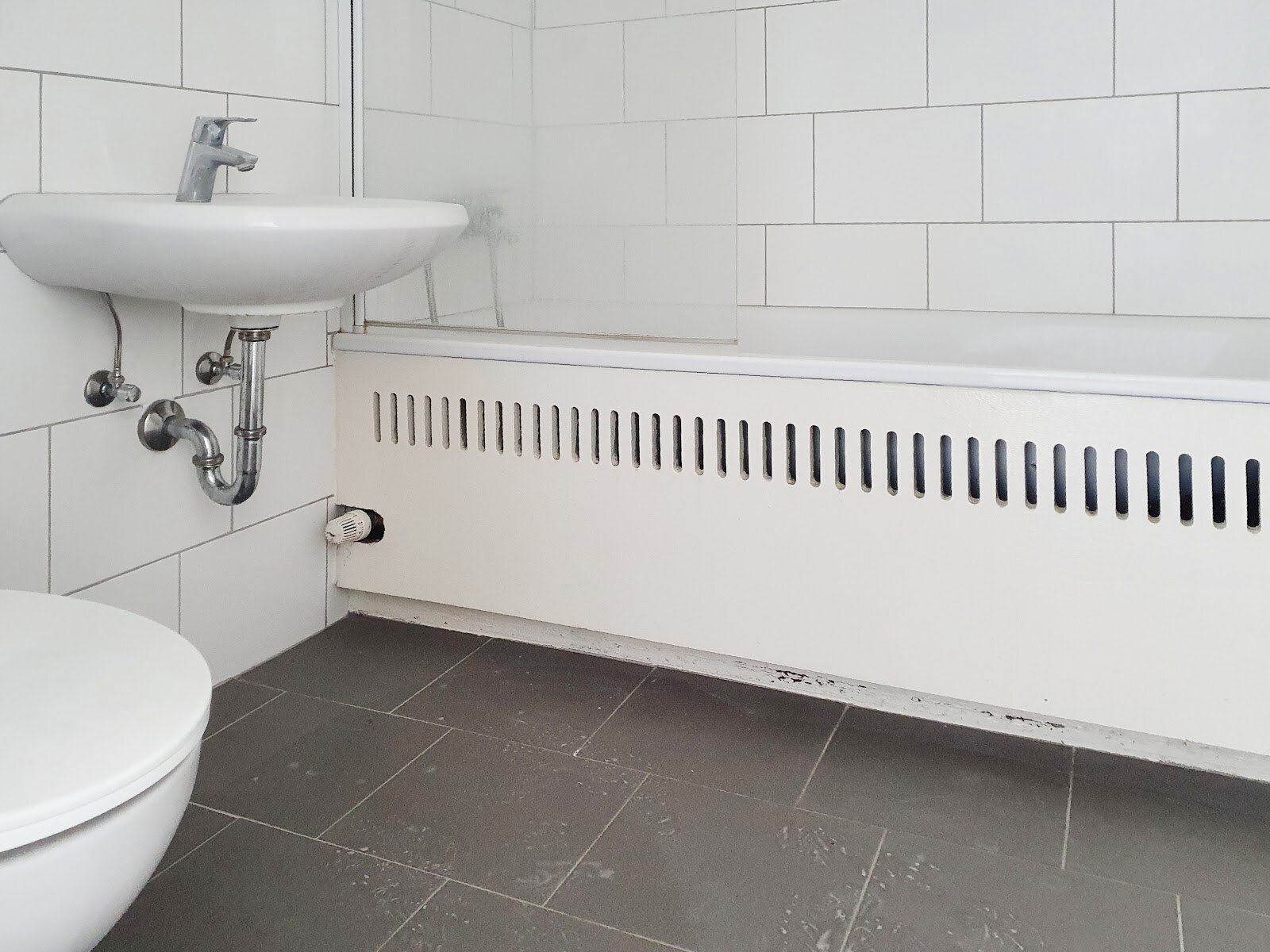 - Anthrazite Boden- und weiße Wandfliesen im Bad