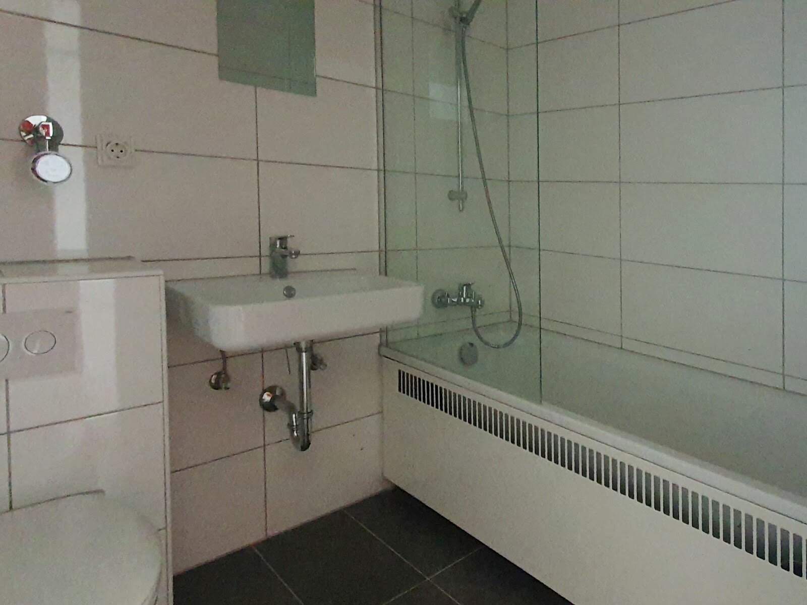 - Anthrazite Boden- und weiße Wandfliesen im Bad