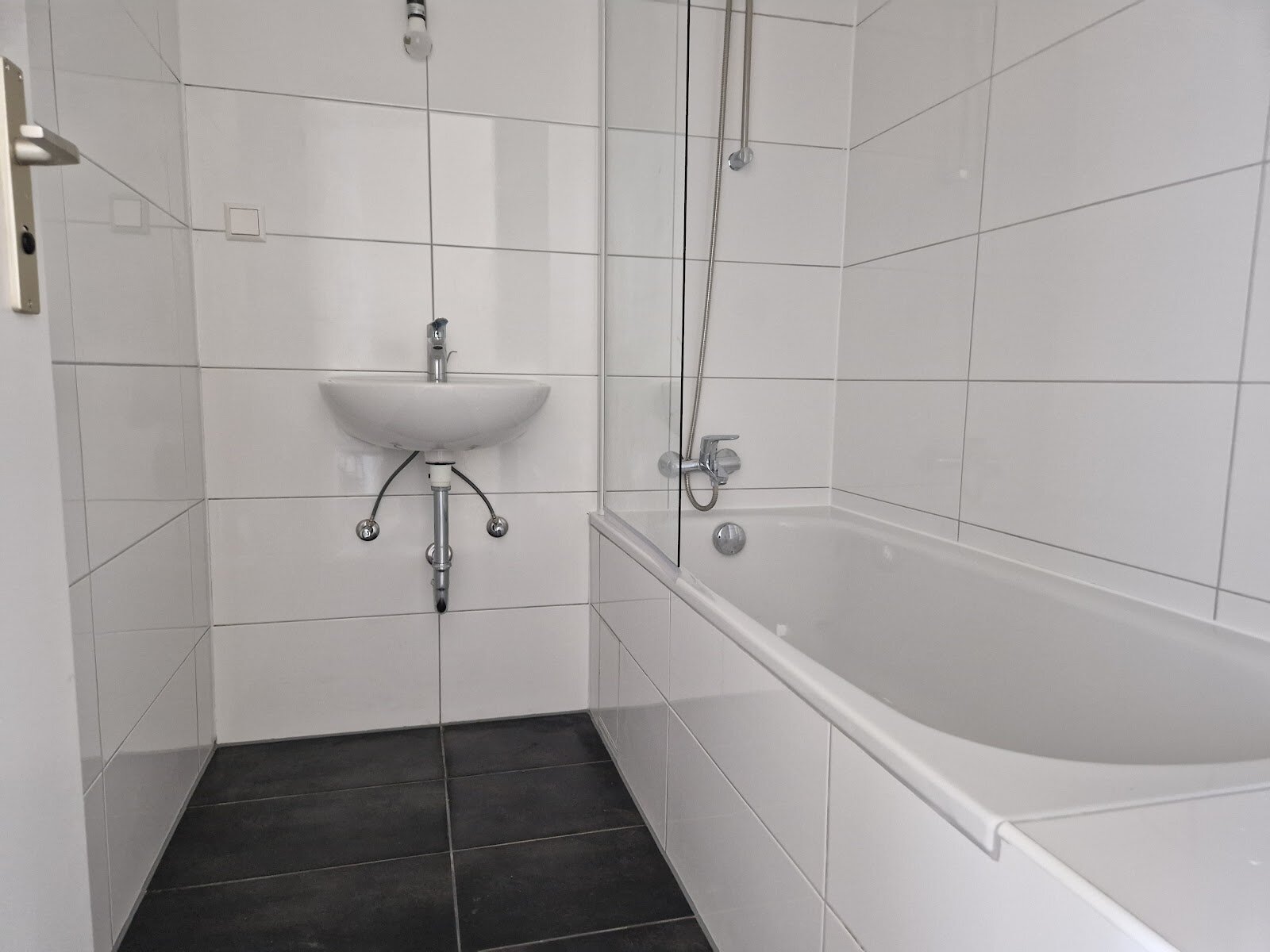 - Anthrazite Boden- und weiße Wandfliesen im Bad