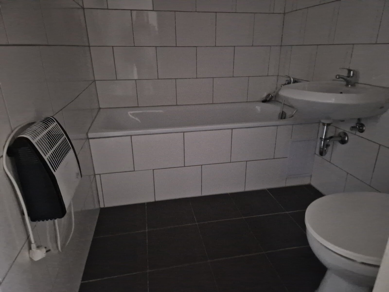 - Anthrazite Boden- und weiße Wandfliesen im Bad