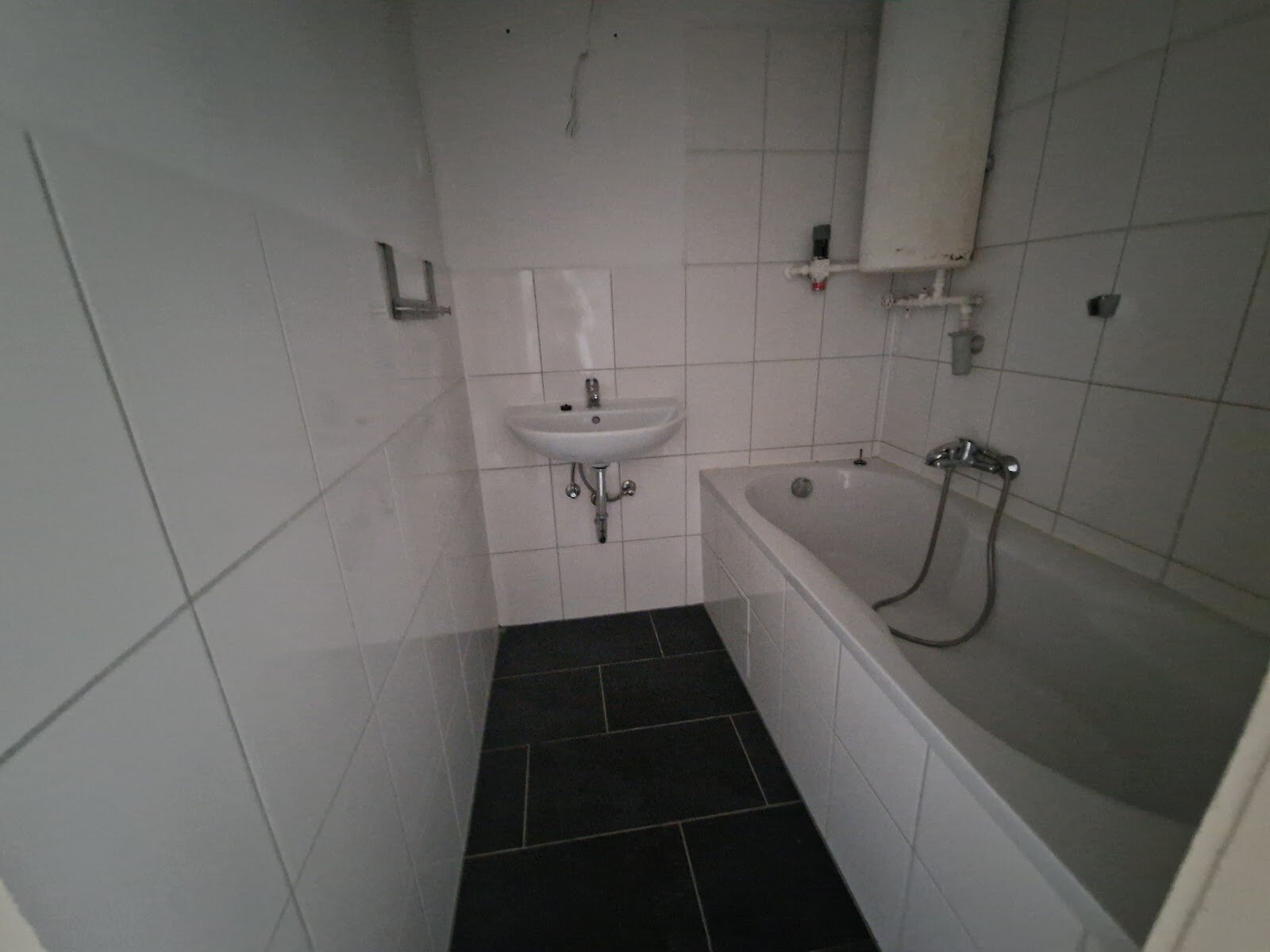 - Anthrazite Boden- und weiße Wandfliesen im Bad
