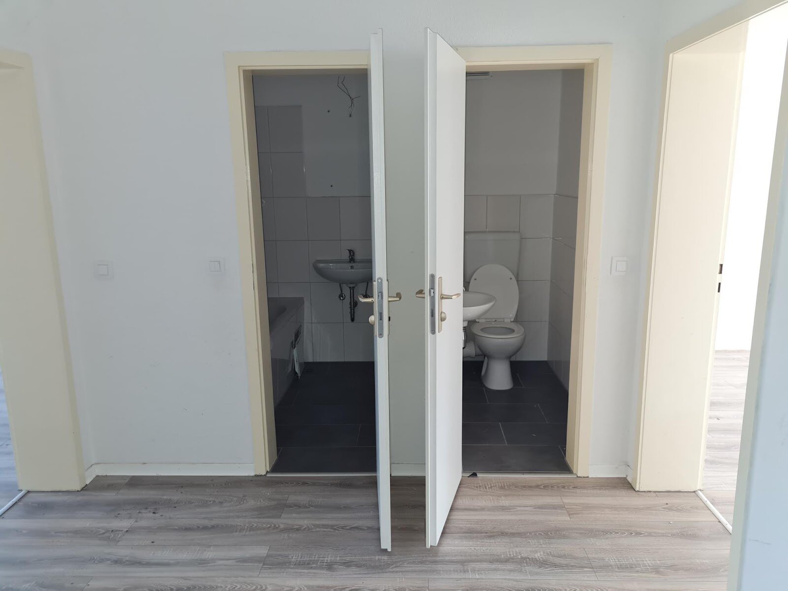 - Laminat- Bodenbelag und Raufasertapete in den Wohnräumen