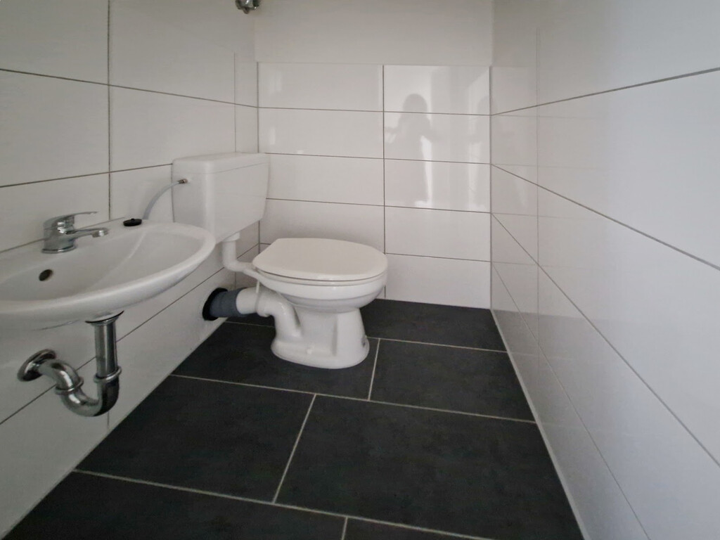 - Anthrazite Boden- und weiße Wandfliesen im Bad