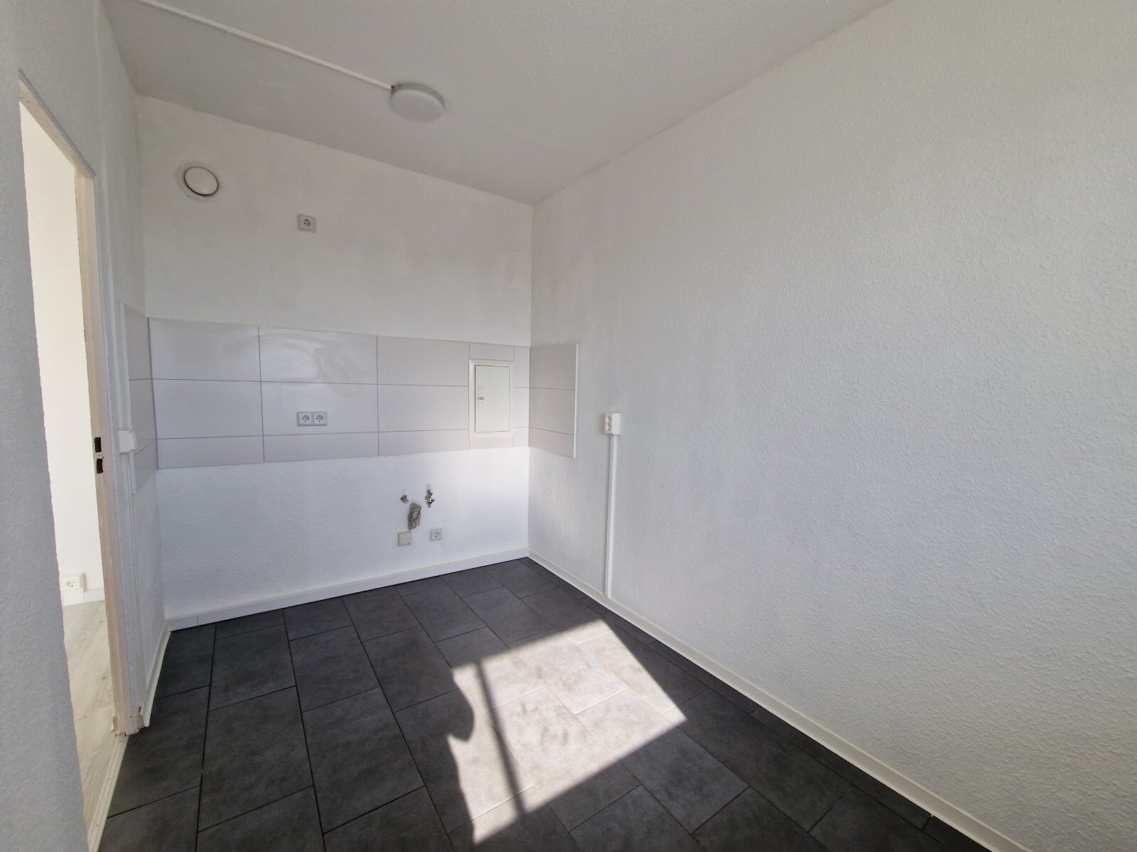- Anthrazite Boden- und weiße Wandfliesen in der Küche