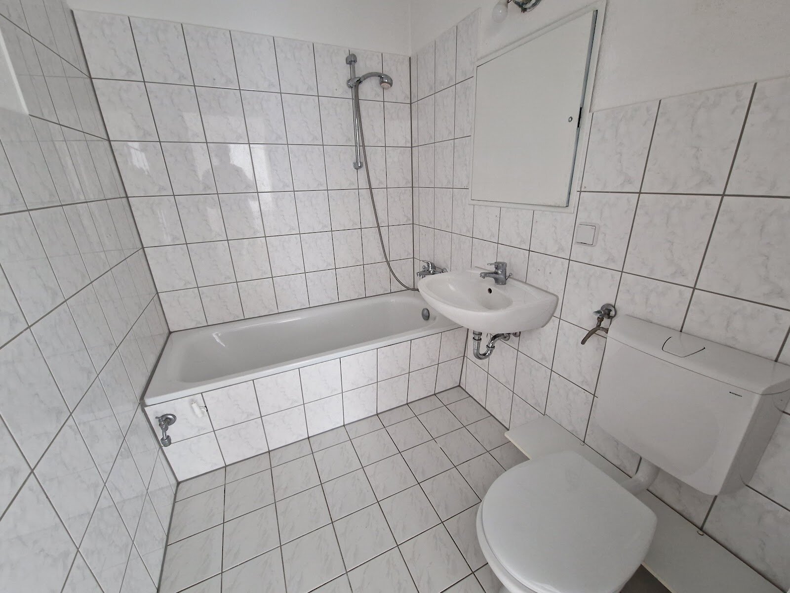 - Helle Boden- und weiße Wandfliesen im Bad