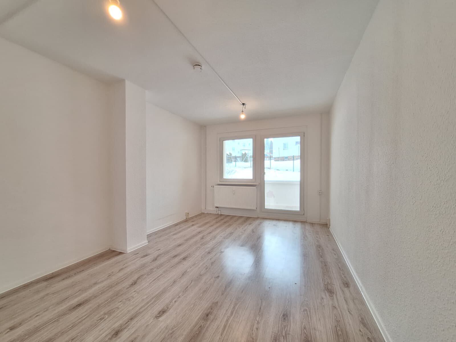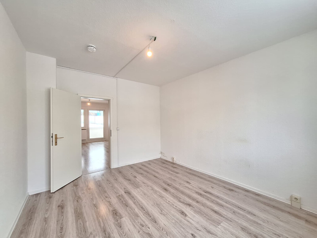 - Laminat-Bodenbelag und Raufasertapete in den Wohnräumen