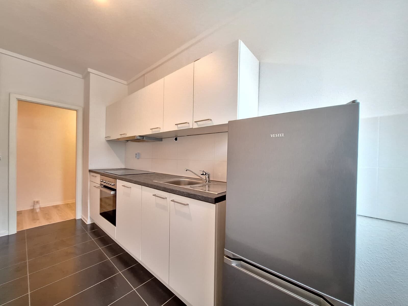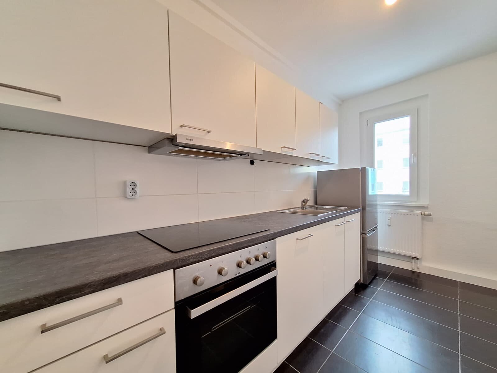 - Anthrazite Boden- und weiße Wandfliesen in der Küche