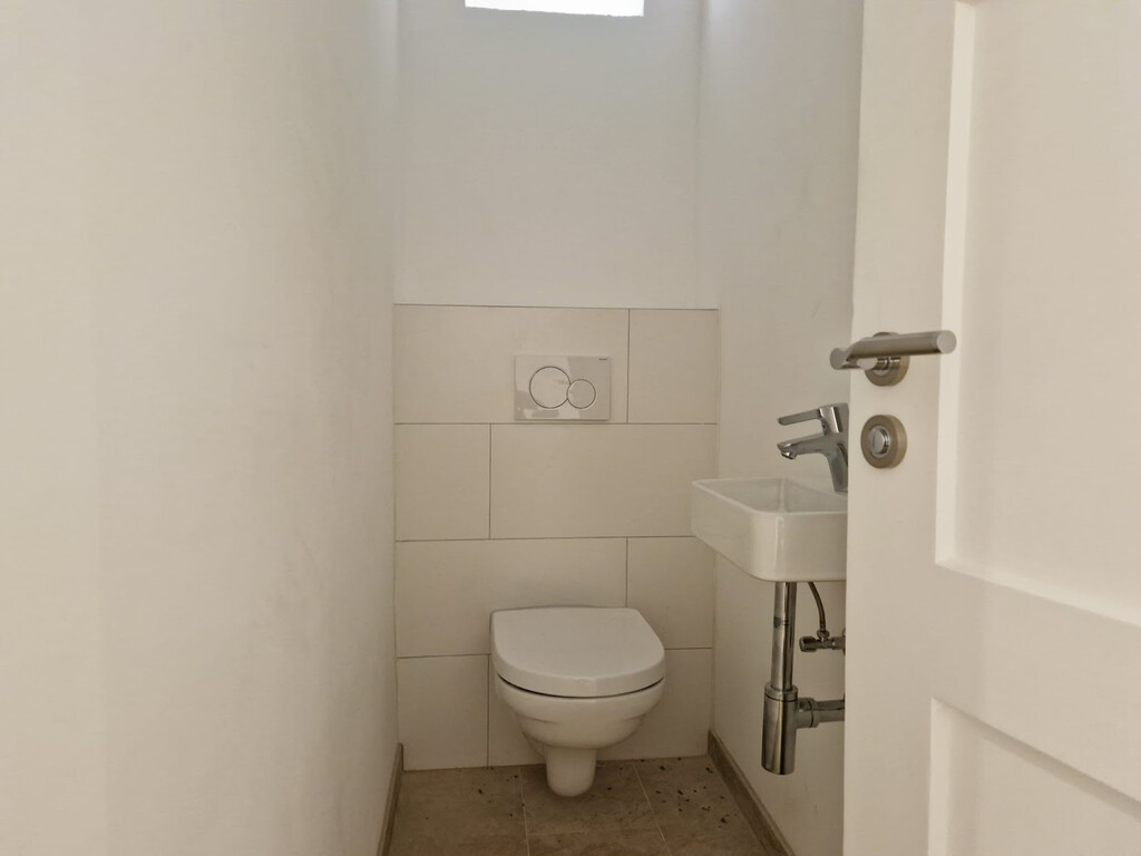 - Anthrazite Boden- und weiße Wandfliesen im Bad