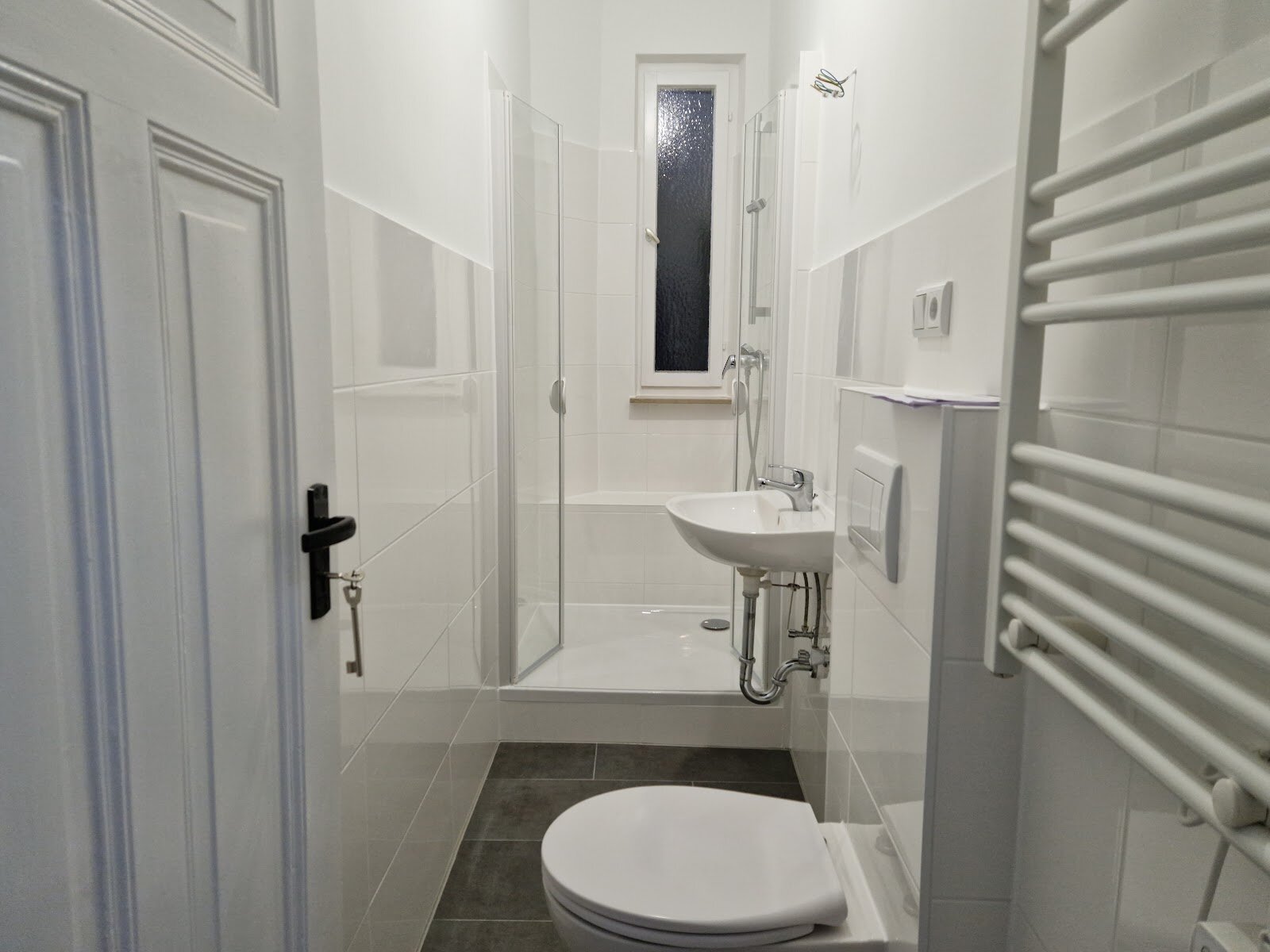 - Anthrazite Boden- und weiße Wandfliesen im Bad