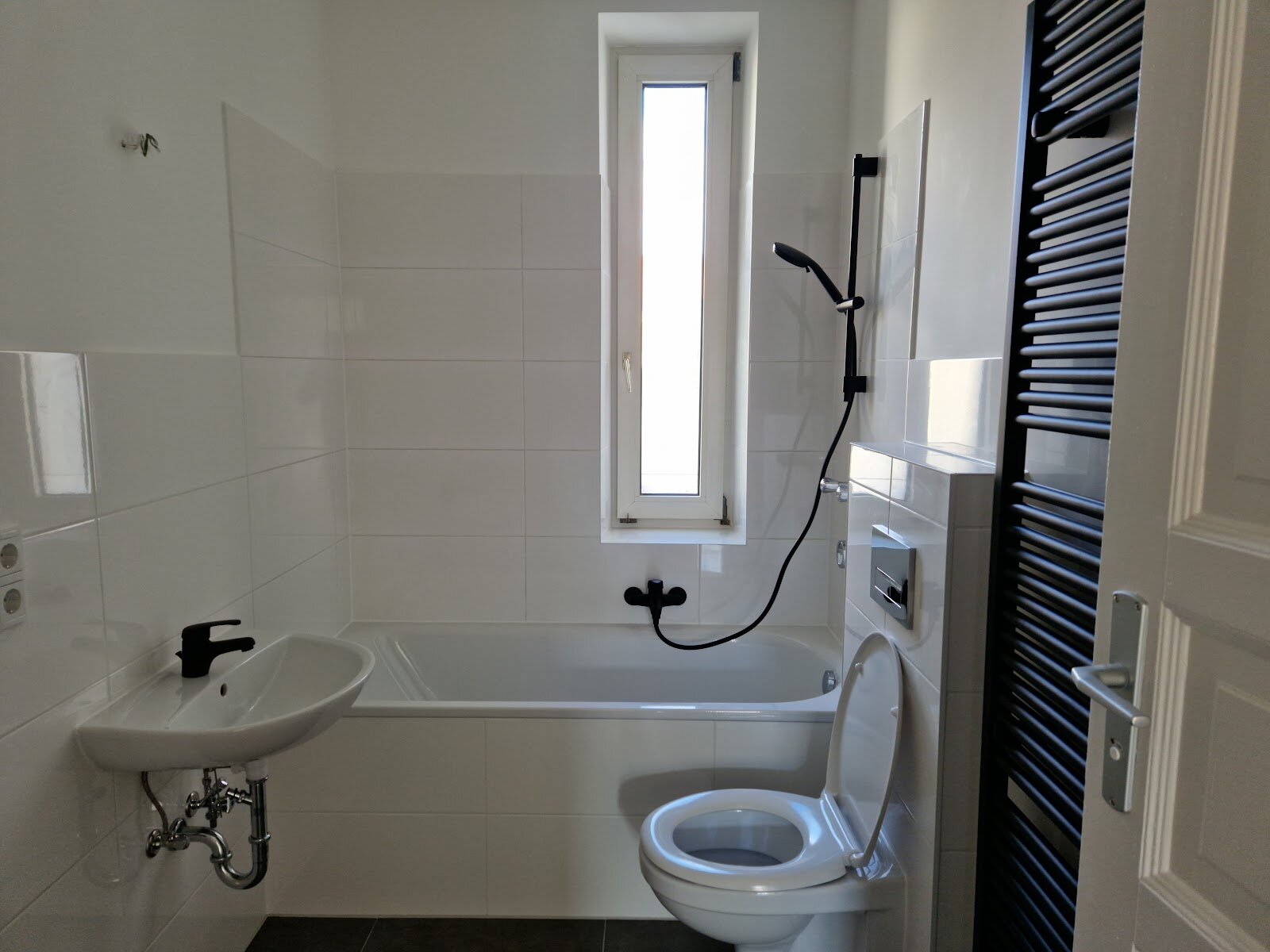 - Anthrazite Boden- und weiße Wandfliesen im Bad