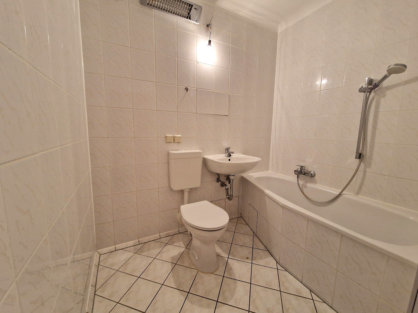 - Weiße Boden- und Wandfliesen im Bad