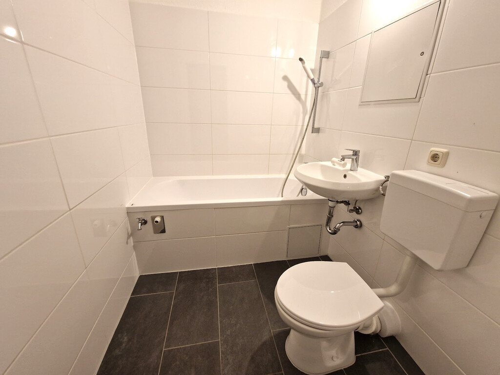 - Anthrazite Boden- und weiße Wandfliesen im Bad