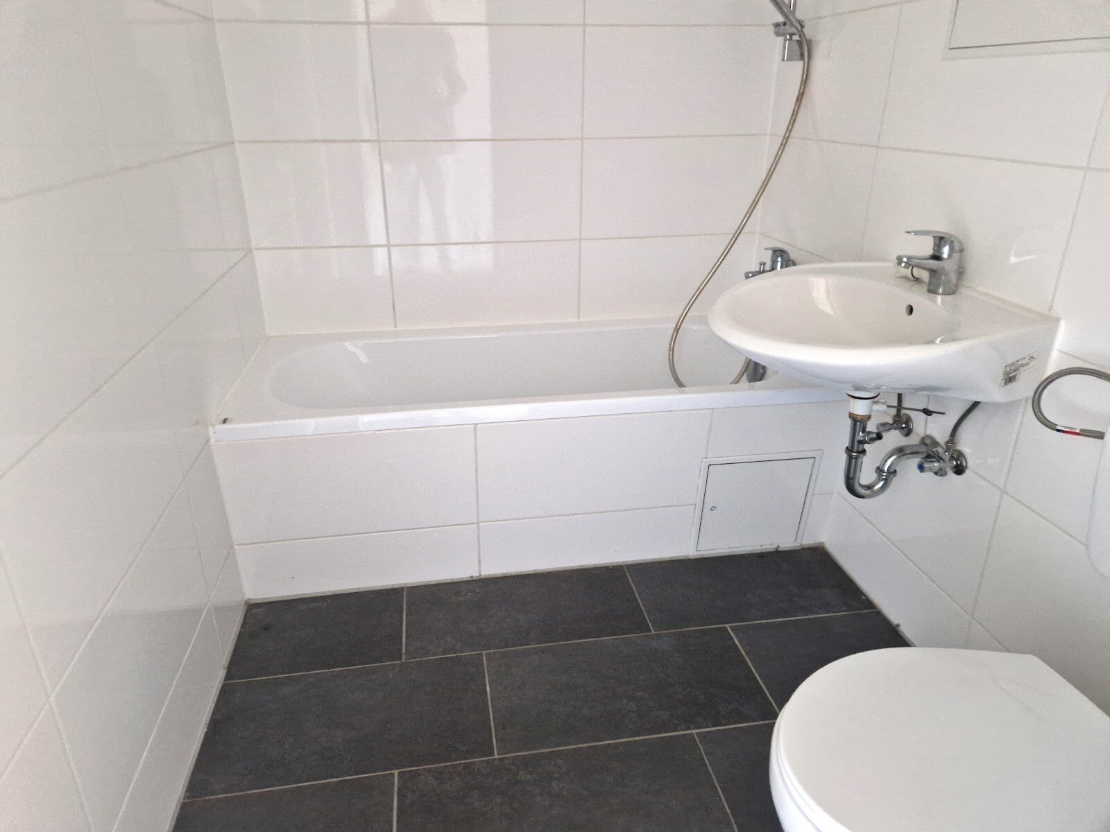 - Anthrazite Boden- und weiße Wandfliesen im Bad