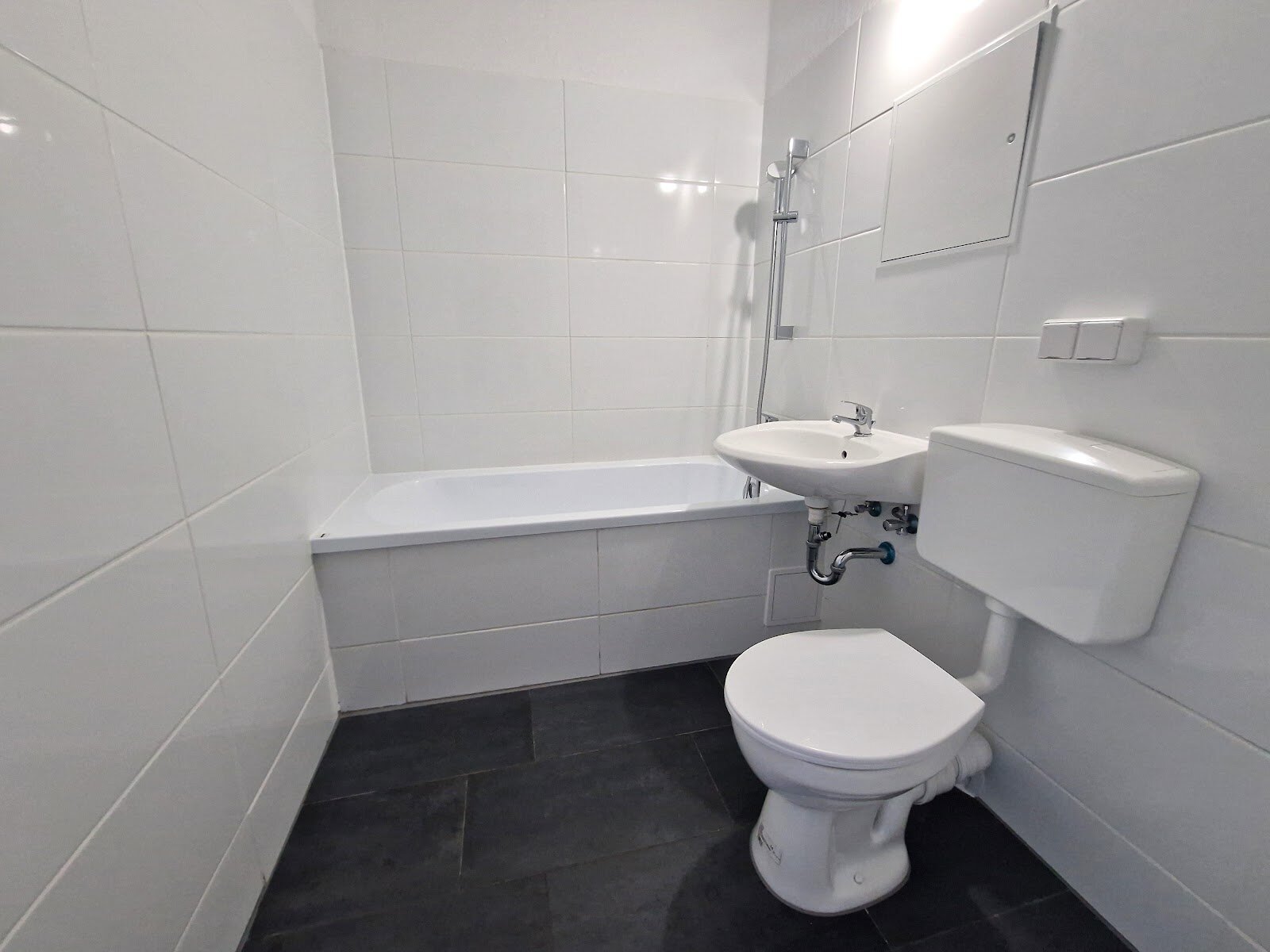 - Anthrazite Boden- und weiße Wandfliesen im Bad