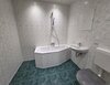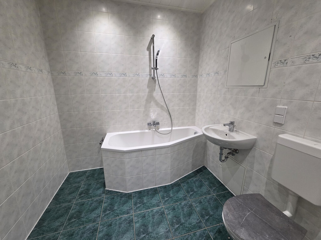 - Grüne Boden- und weiße Wandfliesen im Bad