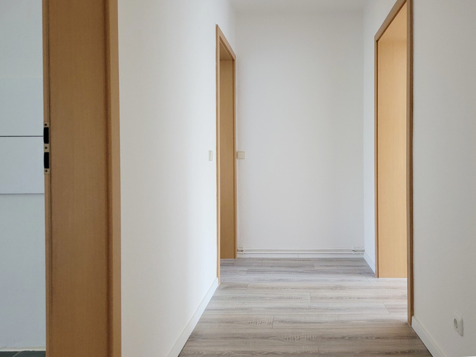 - Laminat Bodenbelag und Raufasertapete in den Wohnräumen