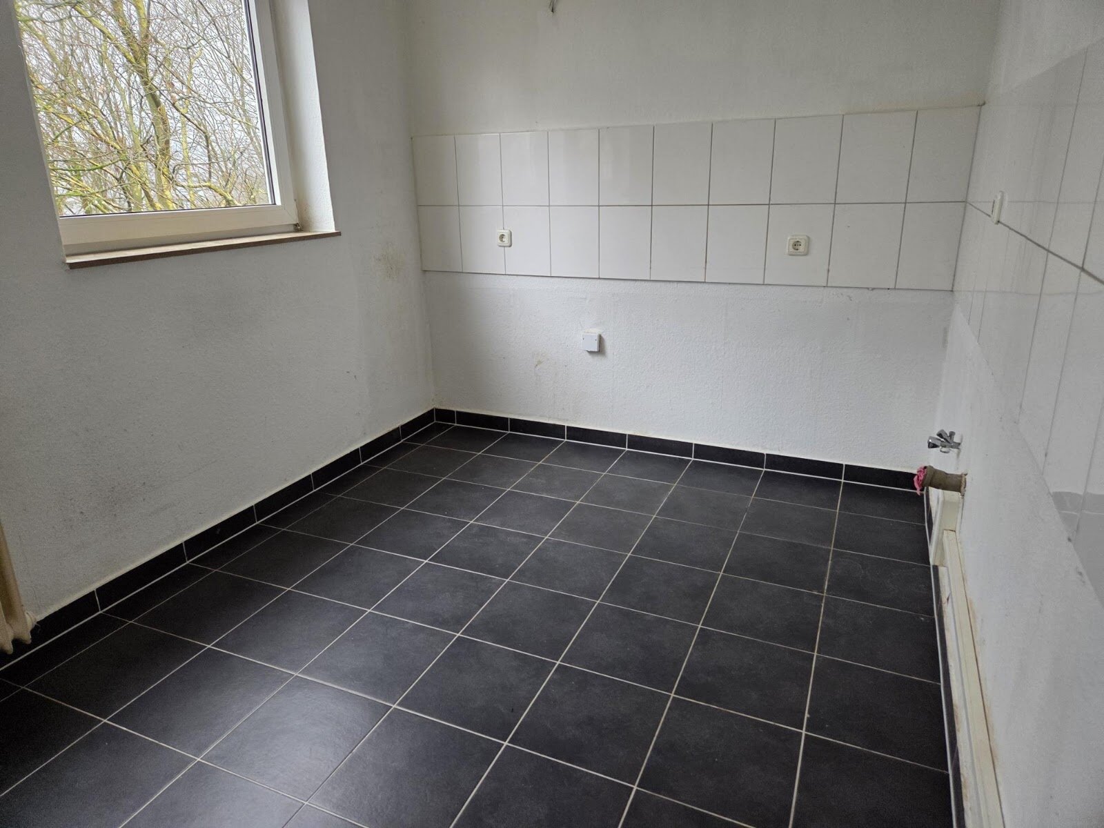 - Anthrazite Boden- und weiße Wandfliesen in der Küche