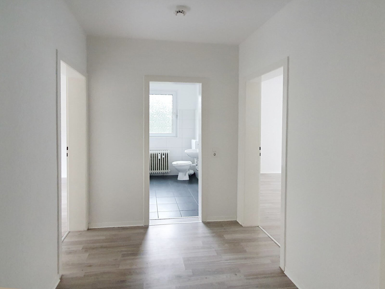 - Laminat-Bodenbelag und Raufasertapete in den Wohnräumen