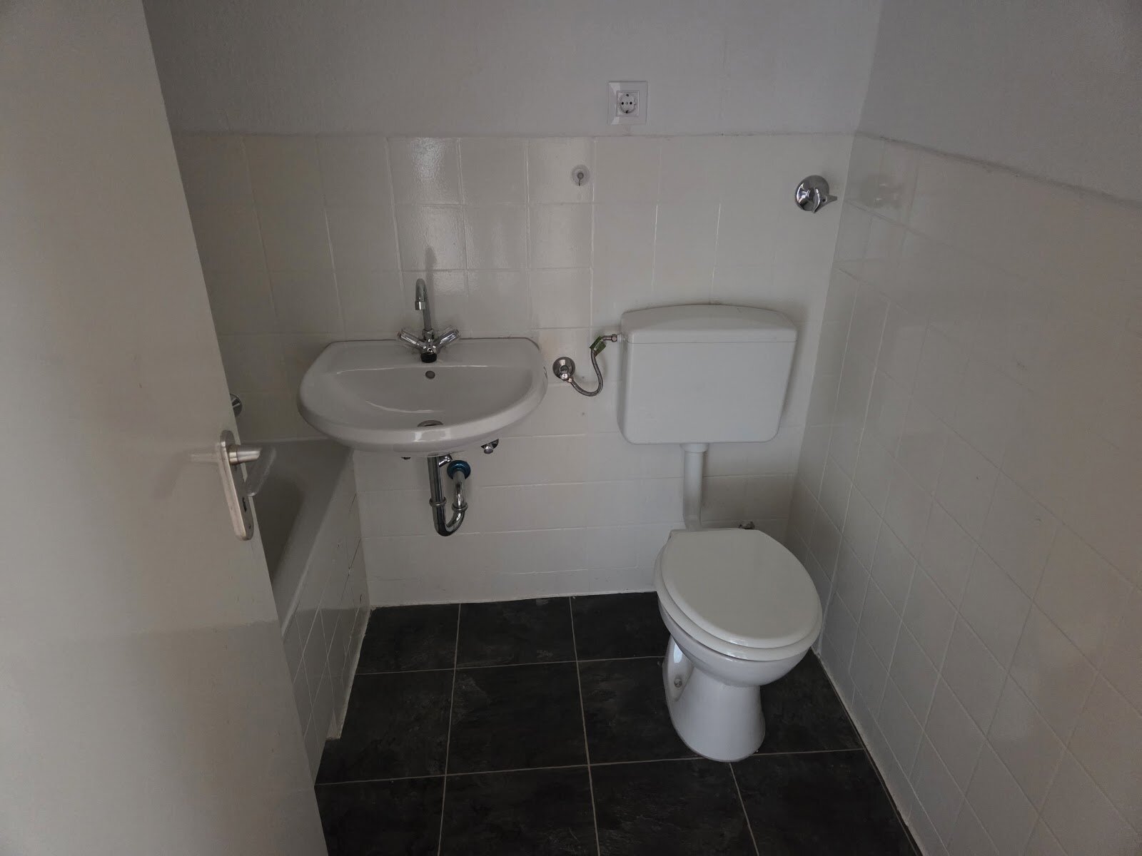 - Anthrazite Boden- und weiße Wandfliesen im Bad