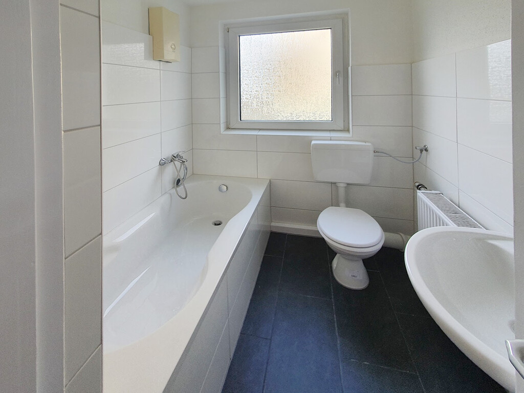 - Anthrazite Boden- und weiße Wandfliesen im Bad