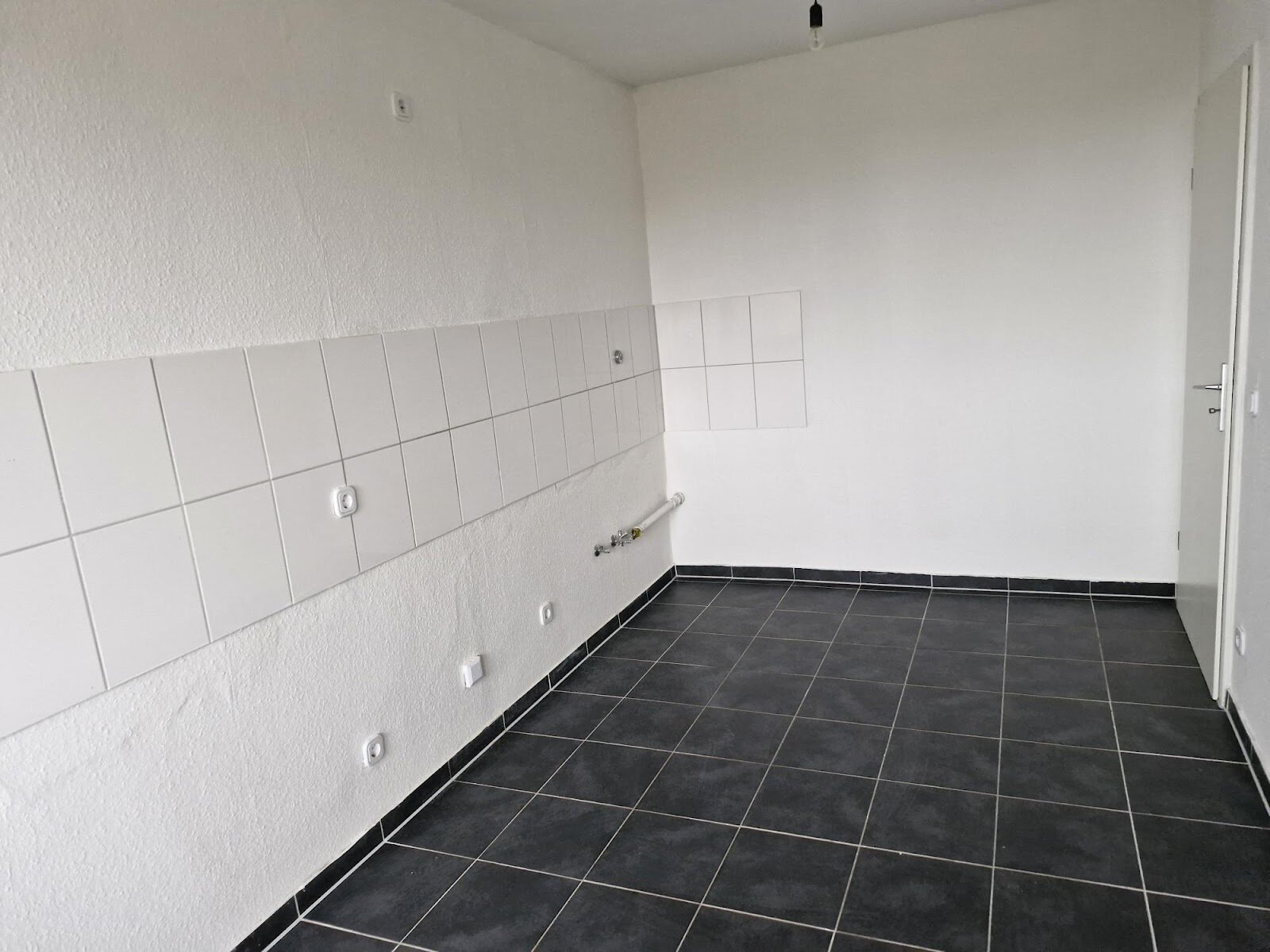 - Anthrazite Boden- und weiße Wandfliesen in der Küche