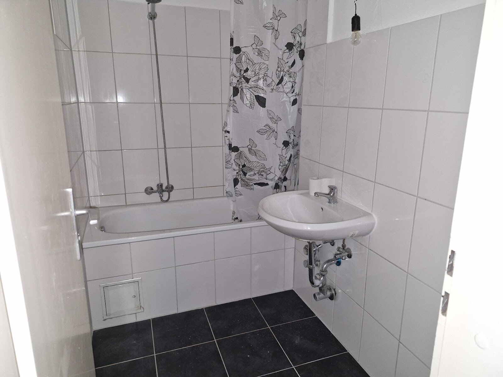 - Anthrazite Boden- und weiße Wandfliesen im Bad