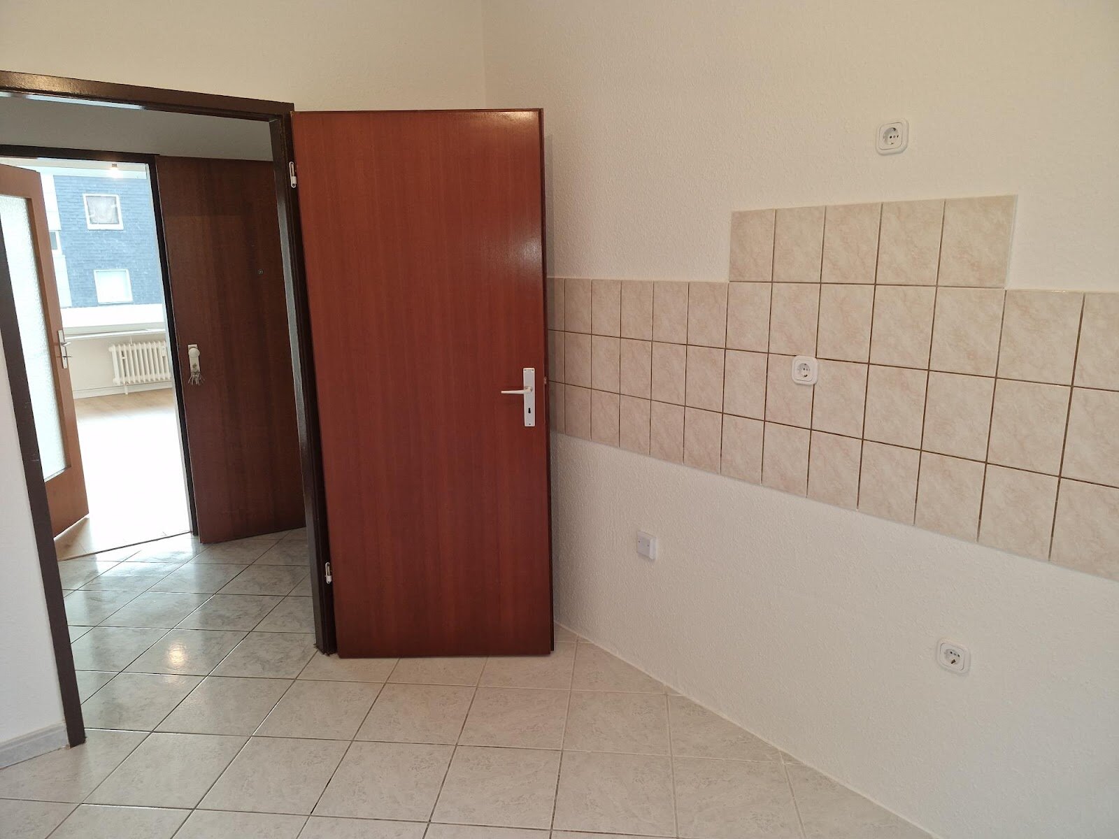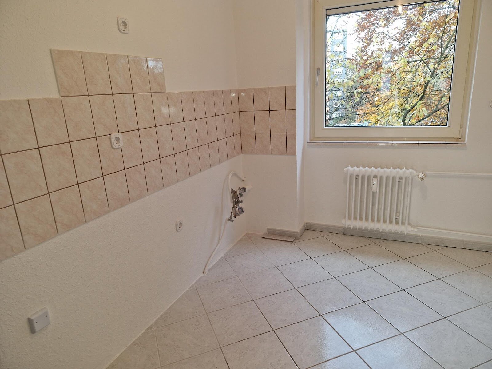 - Hellgraue Boden- und beige Wandfliesen in der Küche
