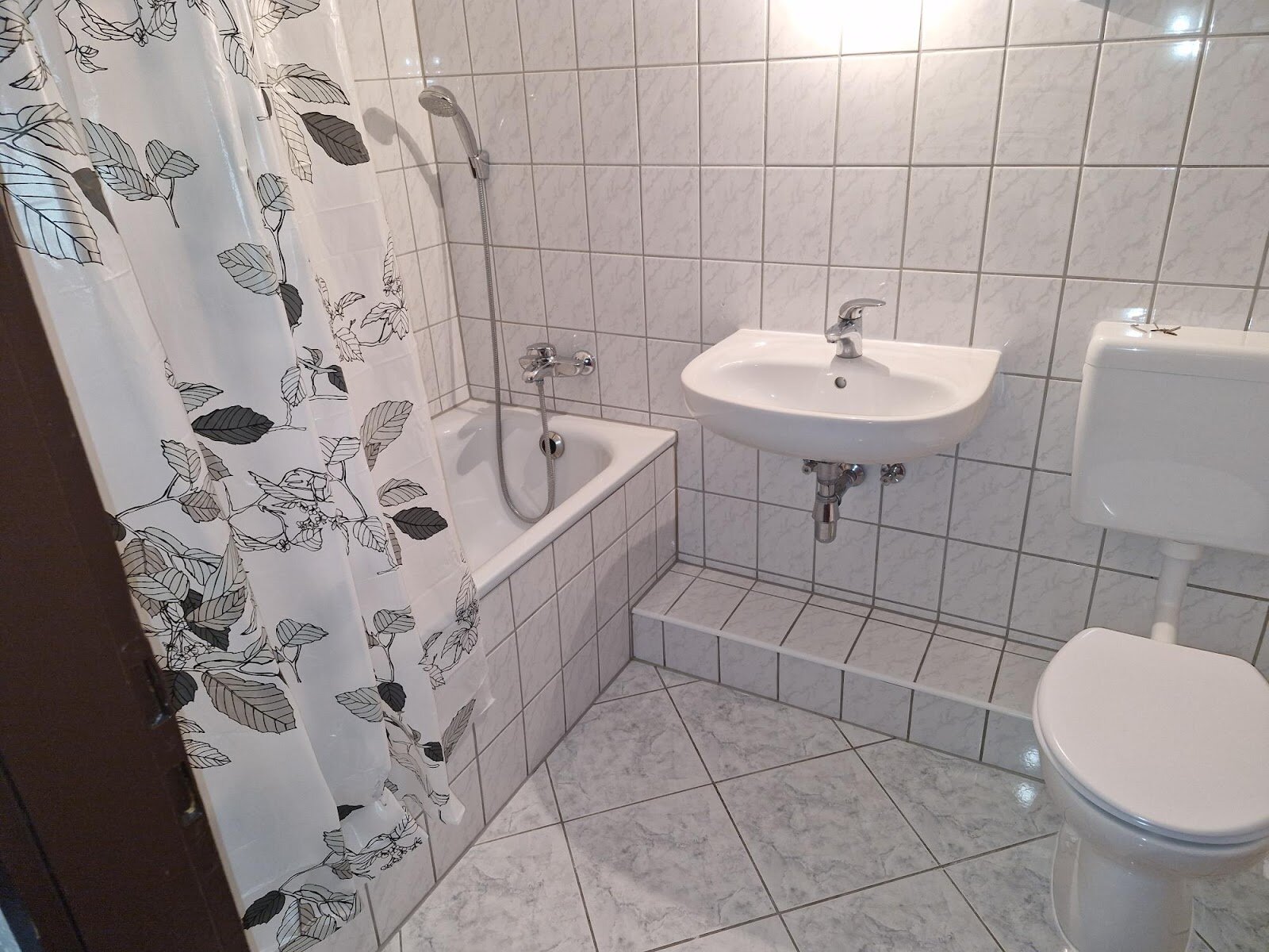 - Hellgraue Boden- und weiße Wandfliesen im Bad