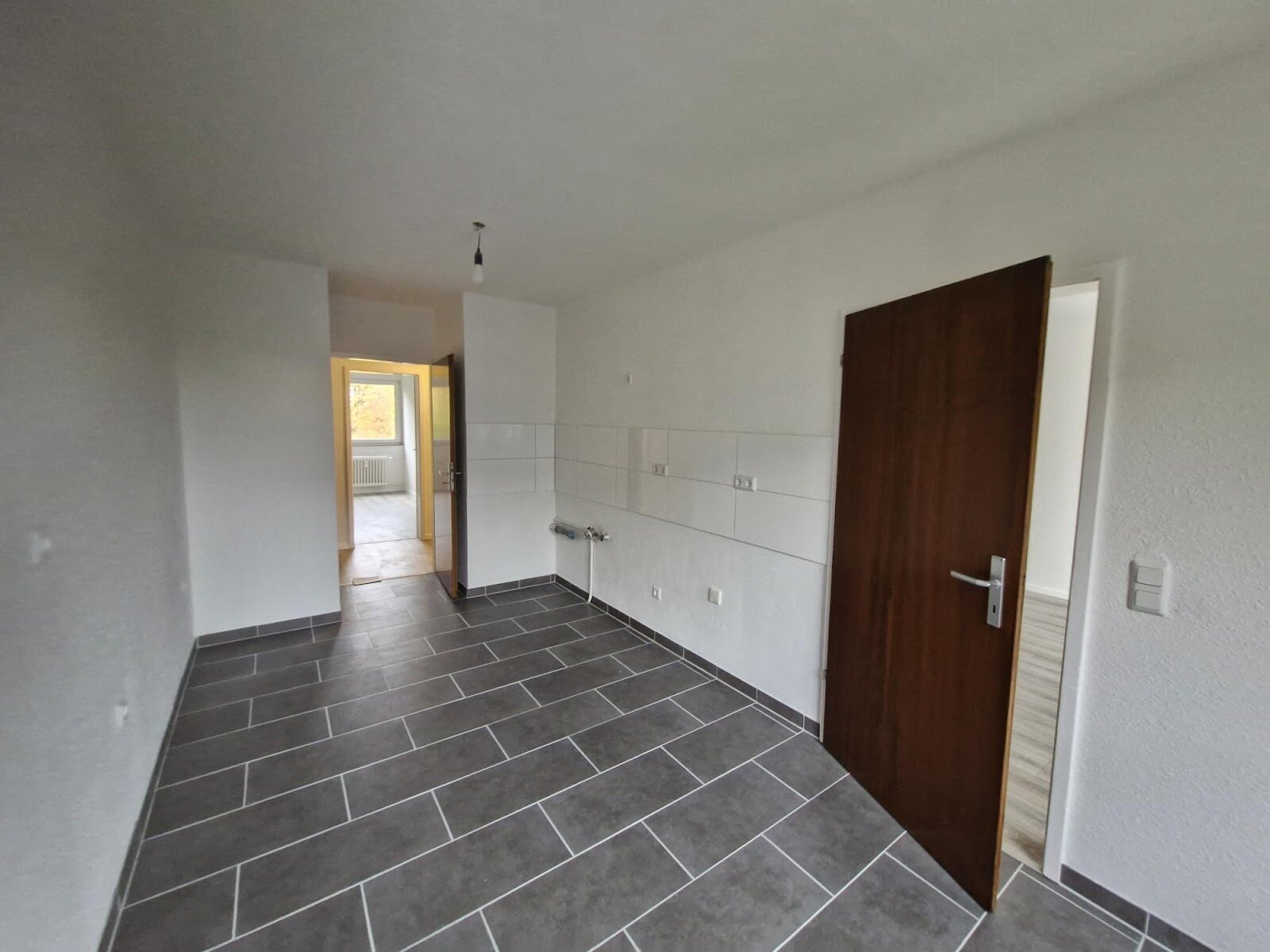- Anthrazite Boden- und weiße Wandfliesen in der Küche