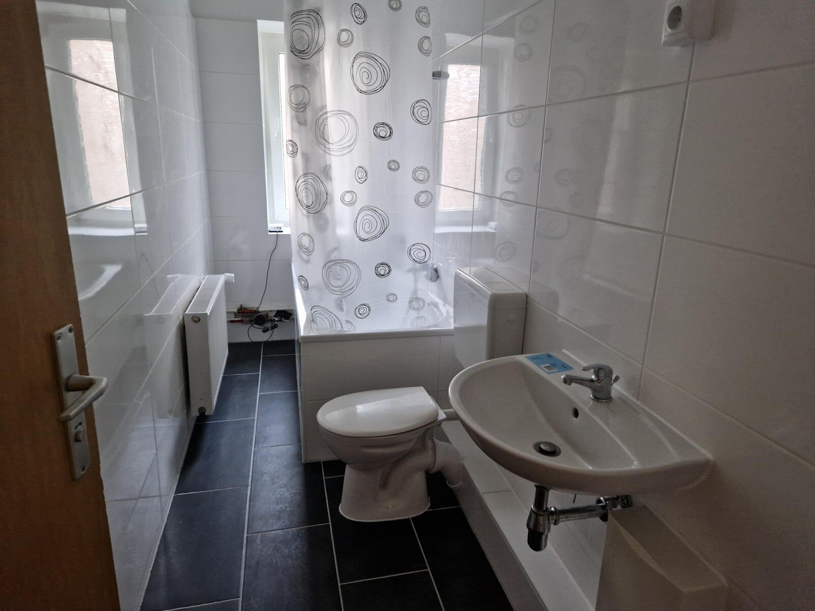 - Anthrazite Boden- und weiße Wandfliesen im Bad