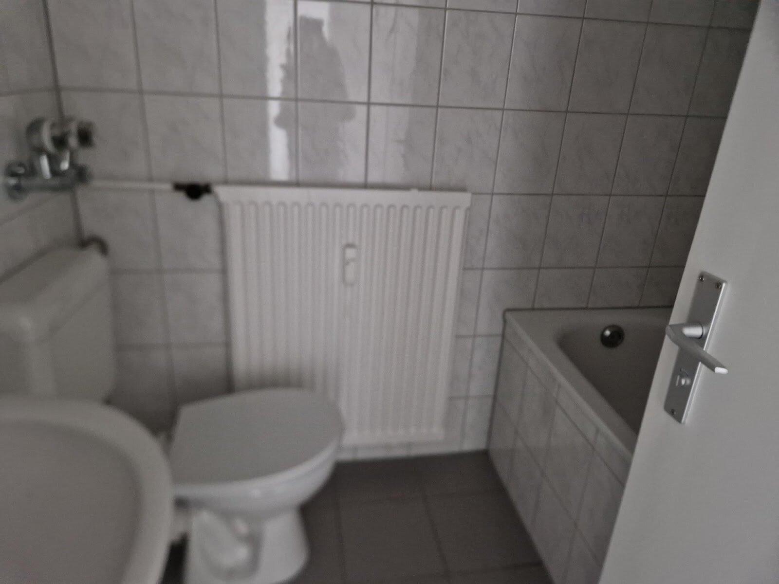 - Anthrazite Boden- und weiße Wandfliesen im Bad